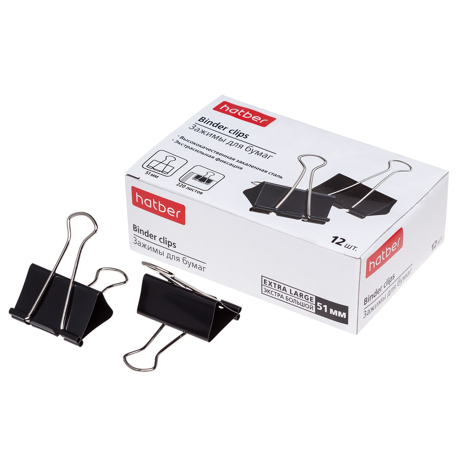 Зажимы черного цвета 51 мм предназначены для скрепления до 220 листов стандартной бумаги. Зажимы для бумаг не мнут документы, не оставляют следов, имеют удобные ушки. Изготовлены из улучшенной закаленной стали, не теряют своих пружинящих свойств даже после длительного использования. Надежно удерживают как один лист, так и стопку бумаг. Упаковка: 12 шт. в картонной коробке.